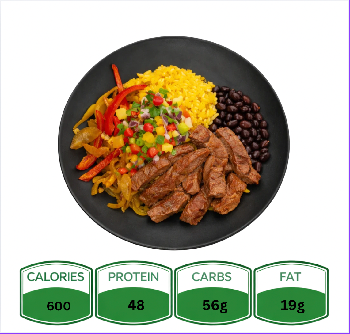 Juicy sautéed flank steak seasoned with smoky fajita spices, sautéed with colorful bell peppers and onions and black beans. Served over a bed of rice and verde sauce —this bold, sizzling bowl delivers all the classic Tex-Mex flavor in a clean, satisfying meal.