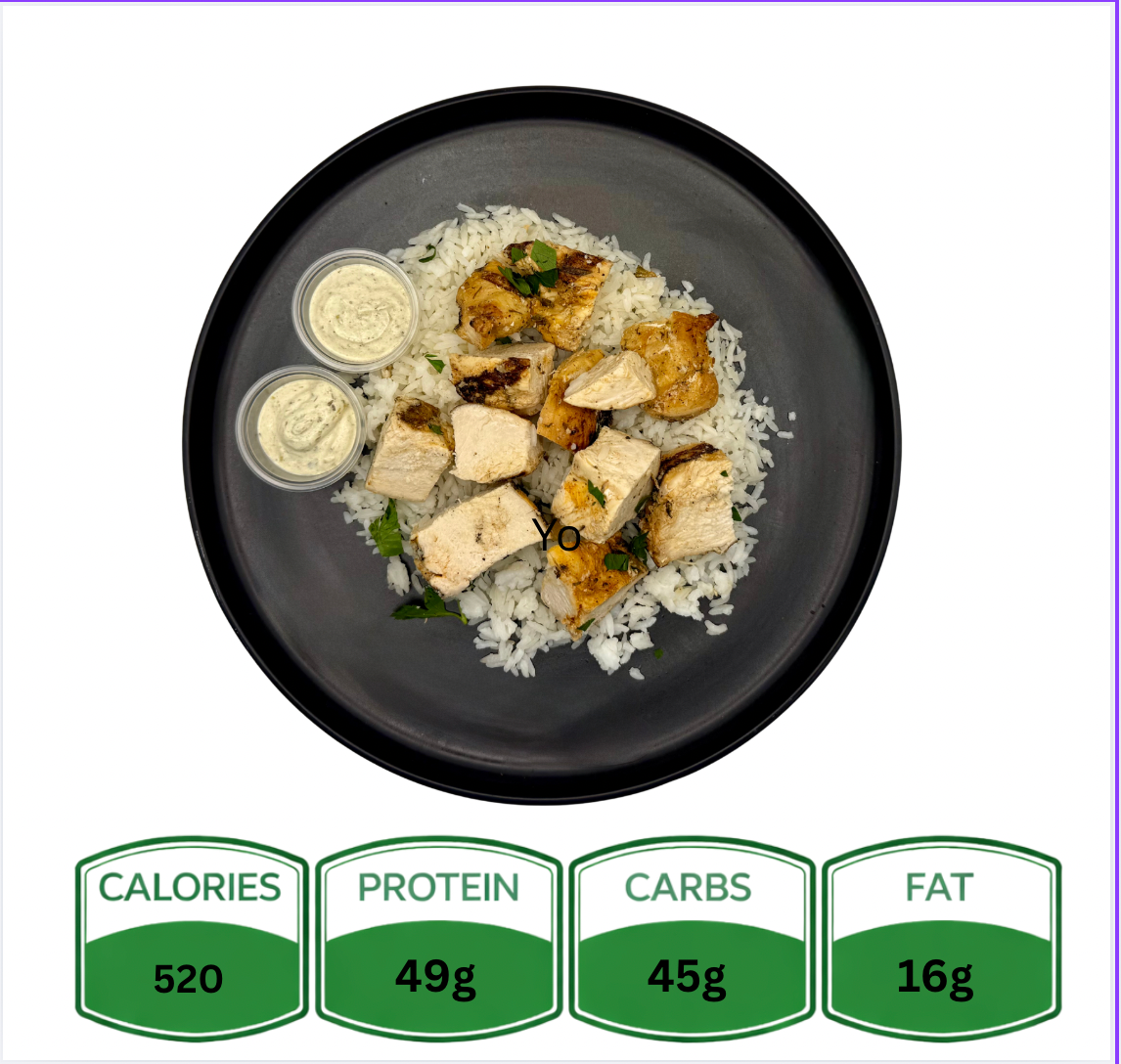 Juicy grilled diced chicken served over fluffy white rice, lightly topped with fresh chopped parsley. Paired with a creamy verde sour cream sauce on the side for the perfect cool, zesty finish. Simple, vibrant, and packed with flavor.