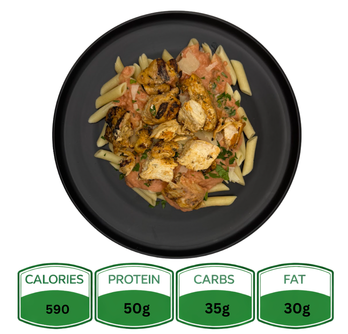 A fiery twist on a classic favorite. Al dente penne pasta is tossed in a rich, creamy vodka sauce with a kick of heat, then topped with perfectly grilled chicken for a bold burst of flavor. Finished with a sprinkle of parmesan and fresh herbs, this dish is indulgent, satisfying, and packed with personality