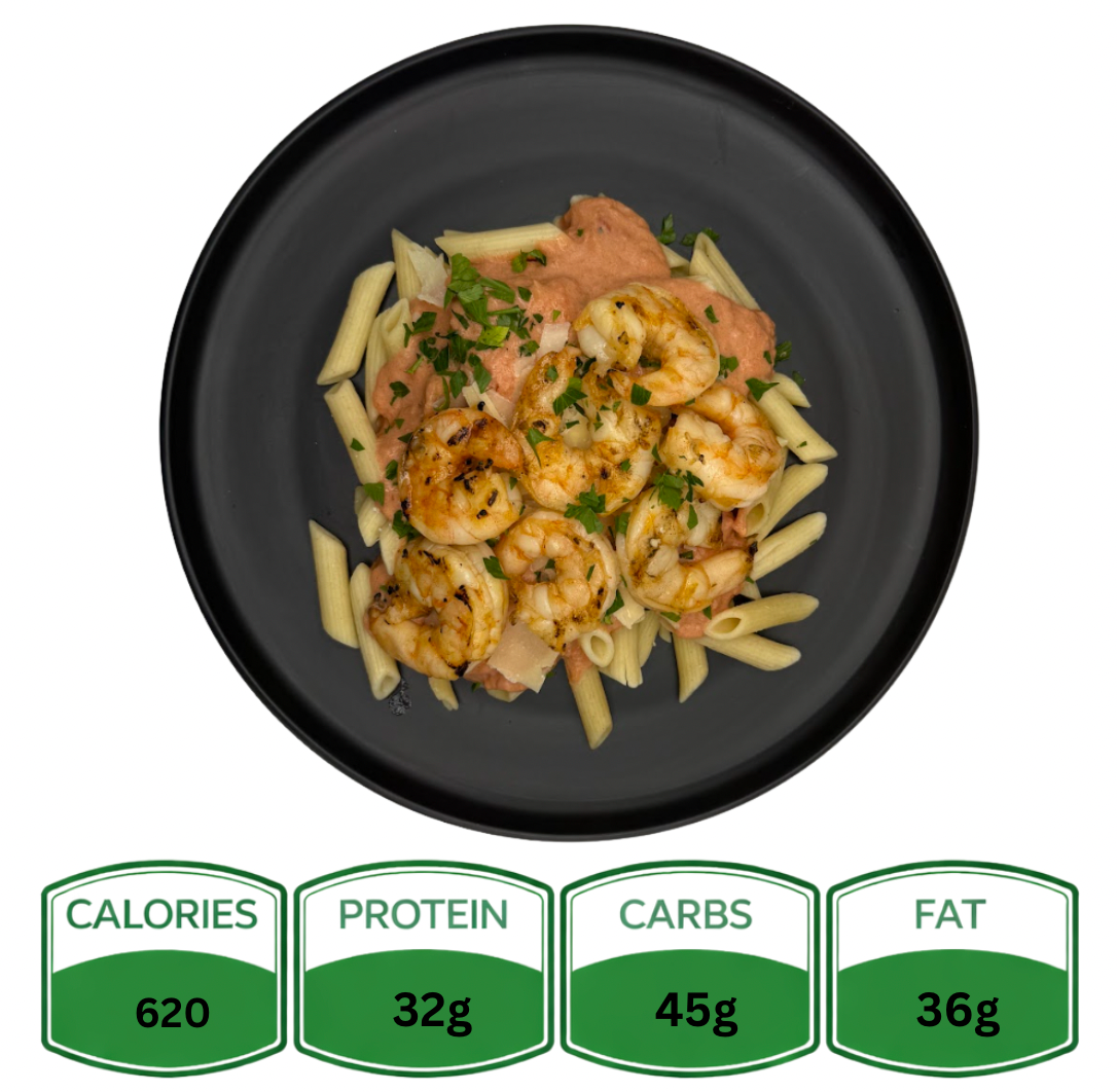 A fiery twist on a classic favorite. Al dente penne pasta is tossed in a rich, creamy vodka sauce with a kick of heat, then topped with perfectly grilled shrimp for a bold burst of flavor. Finished with a sprinkle of parmesan and fresh herbs, this dish is indulgent, satisfying, and packed with personality